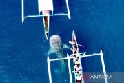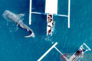 Foto aerial seekor Hiu Paus (Rhincodon typus) berenang mendekati perahu wisata di objek wisata Desa Botubarani, Kabupaten Bone Bolango, Gorontalo, Selasa (10/1/2023). Sejak awal bulan Januari 2023. satu hingga tiga ekor Hiu Paus terlihat di objek wisata unggulan di Provinsi Gorontalo tersebut. ANTARA FOTO/Adiwinata Solihin/aww.