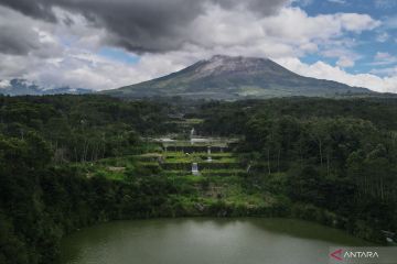 Foto aerial Gunung Merapi dari Sleman, DI Yogyakarta, Selasa (10/1/2023). Menurut data BPPTKG Yogyakarta periode pengamatan 10 Januari 2023 pukul 00.60-12.00 WIB telah terjadi 12 guguran dengan potensi bahaya berupa guguran lava pijar dan awan panas Gunung Merapi pada sektor selatan-barat daya serta sektor tenggara, status level III atau siaga. ANTARA FOTO/Hendra Nurdiyansyah/foc.