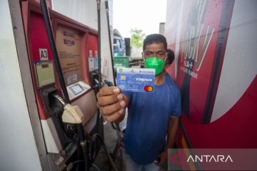 Seorang pengemudi memperlihatkan Fuel Card 3.0 saat mengisi Bahan Bakar Minyak (BBM) solar subsidi di SPBU Madani, Batam, Kepulauan Riau, Minggu (15/1/2023). Dalam upaya antisipasi penyelewengan BBM subsidi Pemerintah Kota Batam bekerja sama dengan Bank KB Bukopin menerapkan sistem kartu kendali untuk pengisian BBM jenis solar. ANTARA FOTO/Teguh Prihatna/pras.