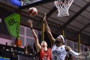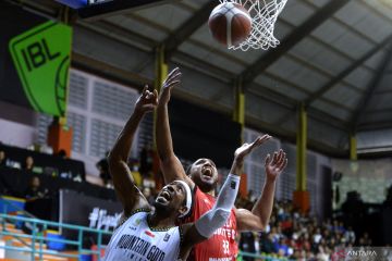Pebasket Bali United Basketball Dior Alexandros Lowhorn (kanan) berebut bola dengan pebasket Mountain Gold Timika Jarrid Jerome Famous (kiri) saat pertandingan Indonesian Basketball League (IBL) 2023 di GOR Merpati, Denpasar, Bali, Rabu (18/1/2023). Bali United Basketball menang atas Mountain Gold Timika dengan skor 79-67. ANTARA FOTO/Fikri Yusuf/hp.