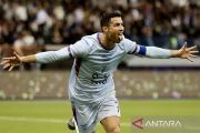 Pemain Riyadh All Star XI Cristiano Ronaldo melakukan selebrasi usai membobol gawang Paris St Germain pada laga persahabatan di King Fahd International Stadium, Riyadh, Arab Saudi, Jumat (20/1/2023). CR7 mencetak dua gol pada debutnya di Arab Saudi, meskipun Riyadh All Star XI harus kalah dari PSG 4-5. ANTARA FOTO/REUTERS/Ahmed Yosri/rwa.