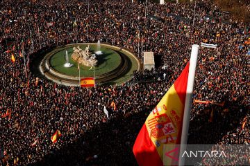 Pengunjuk rasa berkumpul guna memprotes pemerintahan Perdana Menteri Spanyol Pedro Sanchez di Lapangan Cibeles di Madrid, Spanyol, (21/1/2023). Mereka menilai Perdana Menteri Pedro Sanchez merusak Konstitusi Spanyol. ANTARA FOTO/REUTERS/Susana Vera/aww.
