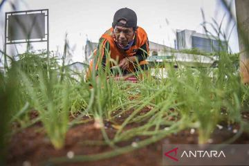 Petugas Penanganan Prasarana dan Sarana Umum (PPSU) menata tanaman di bawah kolong Tol Becakayu (Bekasi Cawang Kampung Melayu), Jakarta, Senin (23/1/2023). Pemprov DKI Jakarta telah melakukan penataan kawasan hijau dengan tanaman hias dan sistem pertanian perkotaan (urban farming) sepanjang 2,7 km dari target lima km di kolong Tol Becakayu guna meningkatkan ketahanan pangan kota. ANTARA FOTO/Galih Pradipta/rwa.
