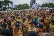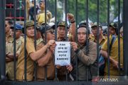 Massa dari Persatuan Perangkat Desa Indonesia (PPDI) melakukan unjuk rasa di depan Gedung DPR, Senayan, Jakarta, Rabu (25/1/2023). Mereka menuntut tentang status kepegawaian perangkat desa, peningkatan kesejahteraan, dan masa jabatan perangkat desa hingga usia enam puluh tahun. ANTARA FOTO/Galih Pradipta/aww