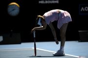 Petenis Kroasia Donna Vekic terlihat kecewa saat bolanya keluar garis ketika melawan petenis Belarus Aryna Sabalenka dalam laga babak perempat final Turnamen Tenis Australian Open, di Melbourne Park, Melbourne, Australia, Rabu (25/1/2023). Aryna Sabalenka melaju ke semi final setelah mengalahkan Donna Vekic straight set (6-3 dan 6-2). ANTARA FOTO/Reuters-Jaimi Joy/hp.