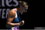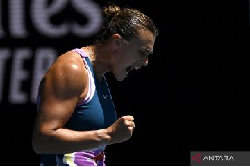 Petenis Belarus Aryna Sabalenka melakukan selebrasi setelah berhasil meraih angka saat melawan petenis Kroasia Donna Vekic dalam laga babak perempat final Turnamen Tenis Australian Open, di Melbourne Park, Melbourne, Australia, Rabu (25/1/2023). Aryna Sabalenka melaju ke semi final setelah mengalahkan Donna Vekic straight set (6-3 dan 6-2). ANTARA FOTO/Reuters-Jaimi Joy/hp.