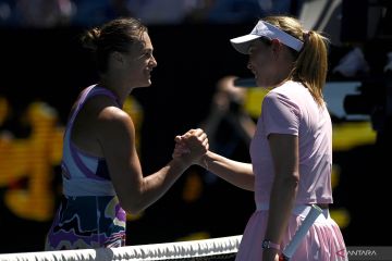 Petenis Belarus Aryna Sabalenka (kiri)) menyalami lawannya petenis Kroasia Donna Vekic usai mereka bertanding dalam laga babak perempat final Turnamen Tenis Australian Open, di Melbourne Park, Melbourne, Australia, Rabu (25/1/2023). Aryna Sabalenka melaju ke semi final setelah mengalahkan Donna Vekic straight set (6-3 dan 6-2). ANTARA FOTO/Reuters-Jaimi Joy/hp.
