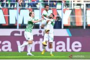 Pesepak bola Sassuolo Matheus Henrique melakukan selebrasi dengan rekannya Domenico Berardi setelah mencetak gol ke gawang AC Milan dalam laga lanjutan Liga Italia, di Stadion San Siro, Milan, Italia, Minggu (29/1/2023). Sassuolo permalukan AC Milan 5-2. ANTARA FOTO/Reuters-Daniele Mascolo/hp.