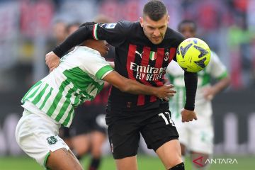 Pesepak bola AC Milan Ante Rebic (kanan_ berebut bola dengan pesepak bola Sassuolo Rogerio (kiri) dalam laga lanjutan Liga Italia, di Stadion San Siro, Milan, Italia, Minggu (29/1/2023). Sassuolo permalukan AC Milan 5-2. ANTARA FOTO/Reuters-Daniele Mascolo/hp.