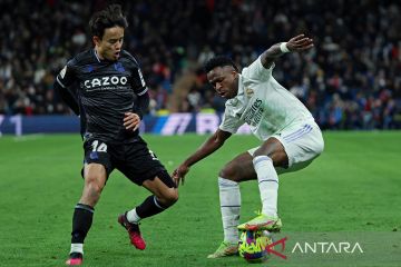 Pesepak bola Real Madrid Vinicius Junior (kanan) berebut bola dengan pesepak bola Real Sociedad Takefusa Kubo dalam laga lanjutan Liga Spanyol di Stadion Santiago Bernabeu, Madrid, Senin (30/1/2023) dinihari. Pertandingan berakhir imbang tanpa gol. ANTARA FOTO/Reuters-Isabel Infantes/nym.