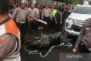 Sejumlah polisi melakukan pengecekan motor yang digunakan mahasiswa UI saat kecelakaan di Jalan Srengseng Sawah, Jagakarsa, Jakarta Selatan, Kamis (2/2/2023). Polda Metro Jaya menggelar rekonstruksi kecelakaan yang menewaskan mahasiswa UI Mohammad Hasya yang dijadikan tersangka dan melibatkan terduga penabrak purnawirawan Polri AKBP Eko Setio Budi dengan menghadirkan sembilan saksi serta melibatkan para pakar hingga kolaborasi interprofesi. ANTARA FOTO/Asprilla Dwi Adha/nym.