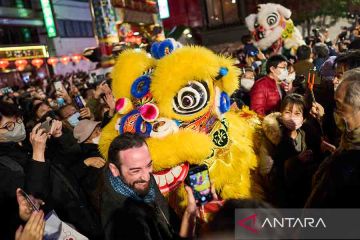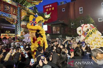 Wisatawan menyaksikan pertunjukan tari barongsai di Pecinan, Yokohama, Jepang, Minggu (5/2/2023). Wisatawan datang ke Pecinan tersebut untuk menikmati suasana meriah Festival Lampion. ANTARA FOTO/Xinhua/Zhang Xiaoyu/rwa.