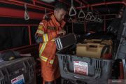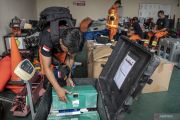 Anggota Basarnas menyiapkan peralatan dan perlengkapan dalam rangka persiapan pengiriman bantuan tim pencarian dan penyelamatan (SAR) ke Turki di lapangan BSG Basarnas, Jakarta, Rabu (8/2/2023). Pemerintah melalui Basarnas akan mengirimkan tim SAR sebanyak 47 personil untuk membantu proses pencarian korban gempa di Turki. ANTARA FOTO/Muhammad Adimaja/hp.