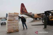 Sejumlah staf memindahkan bantuan kemanusiaan di Bandara Militer Marka, Amman, Yordania, Rabu (8/2/2023). Yordania pada Selasa (7/2/2023) mengirimkan bantuan kemanusiaan serta tim penyelamat ke Suriah dan Turki guna membantu mencari korban selamat setelah gempa bumi dahsyat mengguncang kedua negara itu. ANTARA FOTO/Xinhua/Mohammad Abu Ghosh/rwa.