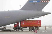 Sebuah kendaraan penyelamat dinaikkan ke dalam pesawat C-17 Globemaster III untuk dikirim ke Turki dari pangkalan udara militer di Otopeni, dekat Bucharest, Rumania, Rabu (8/2/2023). Tiga pesawat militer Rumania dan satu pesawat C-17 Globemaster III yang berbasis di Hongaria bertolak menuju Turki dengan membawa tim penyelamat dan peralatan untuk memberikan bantuan bagi negara yang dilanda gempa tersebut. ANTARA FOTO/Xinhua/Cristian Cristel/rwa.
