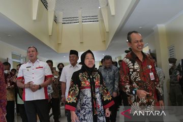 Menteri Sosial Tri Rismaharini (tengah) bersama Direktur Jenderal Perumahan Kementerian PUPR Iwan Suprijanto (kanan) dan Plt Wali Kota Bekasi Tri Adhianto (kiri) meninjau rumah susun di sentra terpadu Pangudi Luhur di Bekasi, Jawa Barat, Jumat (10/2/2023). Rumah susun untuk Pemerlu Pelayanan Kesejahteraan Sosial (PPKS) terdiri dari 93 unit yang dapat menampung 360 orang dengan biaya Rp10.000 per bulan. ANTARA FOTO/ Fakhri Hermansyah/nym.