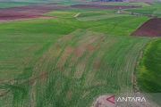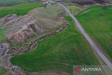 Foto udara menunjukkan retakan tanah pascagempa di Desa Tevekkeli, Kahramanmaras, Turki, Jumat (10/2/2023). ANTARA FOTO/REUTERS/Issam Abdallah/rwa.
