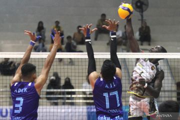 Pebola voli Surabaya BIN Samator Daouda Yacoubou (kanan) melakukan smes yang berusaha ditahan pebola voli Kudus Sukun Badak Aji Maulana (kiri) dan Adik Tri Yulianto (tengah) dalam pertandingan PLN Mobile Proliga 2023 Putaran Kedua Pekan Kedua di GOR Ken Arok, Malang, Jawa Timur, Minggu (12/2/2023). Surabaya BIN Samator menang atas Kudus Sukun Badak dengan skor 3-0 (25-23, 25-22, 25-21). ANTARA FOTO/Ari Bowo Sucipto/foc.