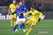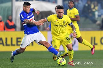 Pemain Inter Milan Lautaro Martinez (kanan) berebut bola dengan pemain Sampdoria Bruno Amione dalam laga lanjutan Liga Italia di Stadion Comunale Luigi Ferraris, Genoa, Italia, Selasa (14/2/2023). Sampdoria selaku tuan rumah berhasil menahan imbang tamunya Inter Milan tanpa gol. ANTARA FOTO/Reuters-Jennifer Lorenzini/nym.