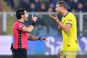 Wasit Fabio Maresca (kiri) memberi peringatan kepada pemain Inter Milan Edin Dzeko saat pertandingan melawan Sampdoria dalam laga lanjutan Liga Italia di Stadion Comunale Luigi Ferraris, Genoa, Italia, Selasa (14/2/2023). Sampdoria selaku tuan rumah berhasil menahan imbang tamunya Inter Milan tanpa gol. ANTARA FOTO/Reuters-Jennifer Lorenzini/nym.