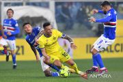 Pemain Inter Milan Lautaro Martinez (tengah) berebut bola dengan pemain Sampdoria Bruno Amione dan Tomas Rincon dalam laga lanjutan Liga Italia di Stadion Comunale Luigi Ferraris, Genoa, Italia, Selasa (14/2/2023). Sampdoria selaku tuan rumah berhasil menahan imbang tamunya Inter Milan tanpa gol. ANTARA FOTO/Reuters-Jennifer Lorenzini/nym.