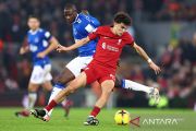 Pemain Liverpool Stefan Bajcetic (depan) berebut bola dengan pemain Everton Abdoulaye Doucoure dalam pertandingan lanjutan Liga Inggris di Stadion Anfield, Liverpool, Inggris, Selasa (14/2/2023). Liverpool berhasil mengalahkan Everton dengan skor 2-0. ANTARA FOTO/Reuters-Carl Recine/nym.