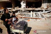 Warga mendorong anaknya menggunakan troli belanja melintasi jalanan yang hancur pascagempa di Hatay, Turki, Selasa (14/2/2023). ANTARA FOTO/REUTERS/Clodagh Kilcoyne/rwa.