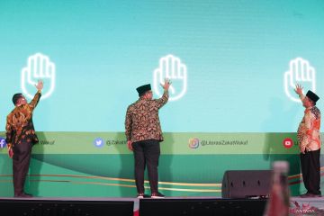 Menteri Agama Yaqut Cholil Qoumas (tengah) didampingi Direktorat Jenderal Bimbingan Masyarakat Islam Kamaruddin Amin (kiri) dan Direktur Pemberdayaan Zakat dan Wakaf Kemenag Tarmizi Tohor (kanan) menekan layar saat pembukaan Rapat Koordinasi Nasional Zakat di Jakarta, Minggu (19/2/2023). Rakornas Zakat yang digelar hingga 21 Februari 2023 tersebut mengangkat tema ÒMenguatkan Kolaborasi, Harmonisasi dan Sinergi Program Maslahat Keagamaan UmatÓ. ANTARA FOTO/Adam/wpa/hp.