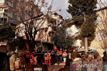 Tim penyelamat melakukan pencarian korban setelah gempa di Provinsi Hatay, Turki (21/2/2023). Badan Penanggulangan Bencana Turki (AFAD) memperingatkan gempa susulan akan terus terjadi setelah gempa dahsyat melanda selatan Turki. ANTARA FOTO/REUTERS/Thaier Al-Sudani/tom.