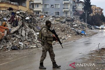 Seorang anggota tentara Turki berjaga di dekat bangunan yang hancur setelah gempa di Antakya, Provinsi Hatay, Turki (21/2/2023). Badan Penanggulangan Bencana Turki (AFAD) memperingatkan gempa susulan akan terus terjadi setelah gempa dahsyat melanda selatan Turki. ANTARA FOTO/REUTERS/Thaier Al-Sudani/tom.