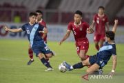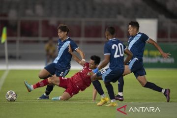 Pesepak bola Timnas U-20 Indonesia Kakang Rudianto (kedua kiri) berebut bola dengan tiga pemain Timnas U-20 Guatemala pada laga uji coba di Stadion Utama Gelora Bung Karno (SUGBK), Senayan, Jakarta, Selasa (21/2/2023). Timnas U-20 Indonesia menyerah 0-1 dari Guatemala. ANTARA FOTO/Wahyu Putro A/tom.