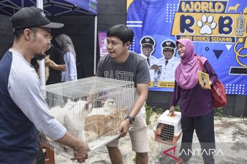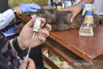 Warga membawa kucing untuk divaksin rabies dalam rangkaian hari rabies sedunia di Lingkungan Lebsi, Kabupaten Ciamis, Jawa Barat, Rabu (22/2/2023). Dinas Peternakan dan Perikanan (Disnakan) Kabupaten Ciamis menggelar vaksinasi rabies gratis bagi hewan peliharaan dalam rangka mewujudkan program pemerintah menuju Indonesia bebas rabies 2030. ANTARA FOTO/Adeng Bustomi/nym.