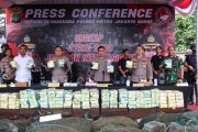 Kapolda Metro Jaya Irjen Pol Fadil Imran (tengah) bersama Kabid Humas Polda Metro Jaya Kombes Pol Trunoyudo Wisnu Andiko (kedua kanan), Dirresnarkoba Polda Metro Jaya Kombes Pol Mukti Juharsa (kiri), Kapolres Metro Jakarta Barat Kombes Pol Pasma Royce (kedua kiri) dan Dandim 0503/Jakarta Barat Letkol Kav I Made Maha Yudhiksa (kanan) menunjukkan barang bukti sabu saat rilis di Polres Metro Jakarta Barat, Kamis (23/2/2023). Polres Metro Jakarta Barat berhasil mengungkap peredaran narkoba jaringan internasional dengan bukti sabu-sabu seberat 277 kg yang disita dari enam orang tersangka. ANTARA FOTO/Prabanndaru Wahyuaji/sgd/hp.