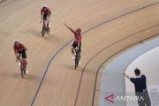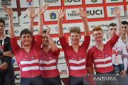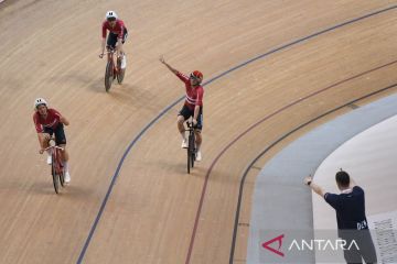 Sejumlah pebalap sepeda tim Denmark berselebrasi usai memenangi final nomor team pursuit putra Tissot UCI Track Nation Cup 2023 di Jakarta International Velodrome, Rawamangun, Jakarta, Jumat (24/2/2023). Tim putra Denmark berhasil meraih medali emas setelah mencapai kecepatan terbaiknya 3 menit 49,210 detik dan mengalahkan tim Selandia Baru yang menduduki peringkat kedua dengan kecepatan 3 menit 49,954 detik. ANTARA FOTO/Aditya Pradana Putra/tom.