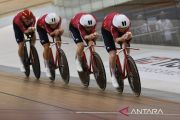 Sejumlah pebalap sepeda tim Denmark melambaikan tangan usai memenangi final nomor team pursuit putra Tissot UCI Track Nation Cup 2023 di Jakarta International Velodrome, Rawamangun, Jakarta, Jumat (24/2/2023). Tim putra Denmark berhasil meraih medali emas setelah mencapai kecepatan terbaiknya 3 menit 49,210 detik dan mengalahkan tim Selandia Baru yang menduduki peringkat kedua dengan kecepatan 3 menit 49,954 detik. ANTARA FOTO/Aditya Pradana Putra/tom.