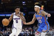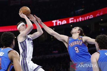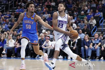 Pebasket Sacramento Kings Keegan Murray (13) menguasai bola dengan dikawal pebasket Oklahoma City Thunder Jeremiah Robinson-Earl (50) pada pertandingan NBA di Paycom Center, Oklahoma City, Oklahoma, AS (26/2/2023). ANTARA FOTO/Alonzo Adams-USA TODAY Sports via Reuters/aww.