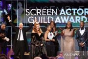 Aktris Lisa Ann Walter, Quinta Brunson and Janelle James menerima penghargaan Outstanding Performance by an Ensemble Comedy Series di "Abbott Elementary" pada ajang Screen Actors Guild Awards ke-29 di Fairmont Century Plaza Hotel, Los Angeles, California, AS (26/2/2023). ANTARA FOTO/REUTERS/Mario Anzuoni/aww.