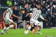 Pesepak bola Juventus Angel Di Maria (kedua kanan) melakukan selebrasi dengan rekan-rekannya setelah mencetak gol ke gawang SC Freiburg dalam laga leg pertama babak 16 besar Liga Europa, di Stadion Allianz Turin, Italia, Kamis (9/3/2023). Juventus berhasil mengalahkan Freiburg 1-0. ANTARA FOTO/Reuters-Massimo Pinca/hp.
