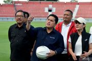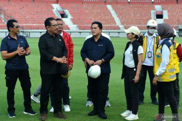 Ketua Umum PSSI Erick Thohir (tengah) didampingi Wakil Ketua Umum PSSI Ratu Tisha Destria (keempat kanan), Wakil Gubernur Bali Tjokorda Oka Artha Ardana Sukawati (kedua kiri) dan Bupati Gianyar I Made Mahayastra (ketiga kiri) meninjau Stadion Kapten I Wayan Dipta, Gianyar, Bali, Minggu (12/3/2023). Peninjauan itu dilakukan untuk memastikan kesiapan Stadion Kapten I Wayan Dipta Bali yang akan digunakan untuk penyelenggaraan Piala Dunia U-20 2023. ANTARA FOTO/Fikri Yusuf/hp.