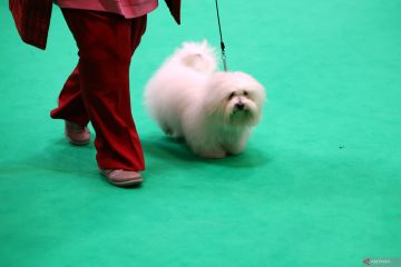 Seorang pemilik anjing membawa anjingnya jenis Coton De Tulear untuk berkompetisi pada hari keempat di pertunjukan anjing Crufts, di Birmingham, Inggris, Minggu (12/3/2023). ANTARA FOTO/Reuters-Molly Darlington/hp.