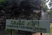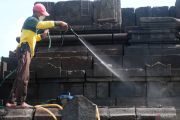 Juru rawat cagar budaya menyemprotkan air saat membersihkan permukaan Candi Asu dari abu vulkanis di Sengi, Dukun, Magelang,, Jawa Tengah, Selasa (14/3/2023). Pembersihan abu vulkanis tersebut untuk menghindari pelapukan dan korosi bangunan candi akibat awan panas guguran (APG) Gunung Merapi yang terjadi pada (11/3/2023). ANTARA FOTO/Anis Efizudin/foc.