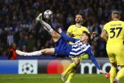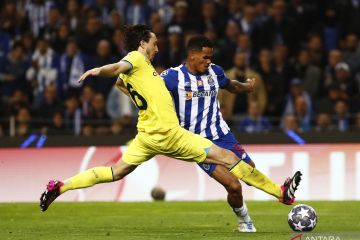 Pesepak bola FC Porto Toni Martinez (kiri) menendang bola ke gawang Inter Milan dalam laga leg kedua babak 16 besar Liga Champions, di Stadion Dragao, Porto, Portugal, Selasa (14/3/2023). Pertandingan ini berakhir imbang 0-0 dan Inter melaju ke perempat final dengan keunggulan agregat gol 1-0. ANTARA FOTO/Reuters--Miguel Vidal/hp.