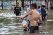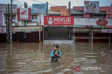 Seorang bocah berjalan di tengah banjir di Pasar Kemis, Kabupaten Tangerang, Banten, Rabu (15/3/2023). Hujan deras yang mengguyur sejak Selasa (14/3) malam menyebabkan kawasan tersebut terendam banjir hingga ketinggian 1,2 meter. ANTARA FOTO/Fauzan/tom.