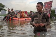 Petugas mengangkut warga menggunakan perahu karet di tengah banjir di Periuk, Kota Tangerang, Banten, Rabu (15/3/2023). Hujan deras yang mengguyur sejak Selasa (14/3) malam menyebabkan kawasan tersebut terendam banjir hingga ketinggian 1,2 meter. ANTARA FOTO/Fauzan/tom.