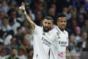 Pemain Real Madrid Karim Benzema berselebrasi dengan rekannya Eder Militao setelah mencetak gol ke gawang Liverpool dalam laga leg kedua babak 16 besar Liga Champions di Santiago Bernabeu, Madrid, Spanyol, Kamis (16/3/2023). Real Madrid mengalahkan Liverpool dengan skor 1-0 dan lolos ke babak perempat final dengan keunggulan agregat 6-2. ANTARA FOTO/Reuters-Susana Vera/nym.