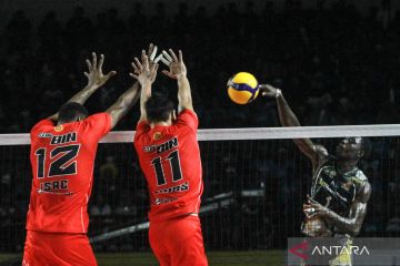 Pebola voli putra Jakarta Stin BIN Dimas Saputra (tengah) dan Isac Viana (kiri) berusaha mengeblok smas dari pebola voli Surabaya BIN Samator Daouda Yacoubou (kanan) saat bertanding pada perebutan peringkat tiga Proliga 2023 di GOR Amongrogo, Yogyakarta, Minggu (19/3/2023). ANTARA FOTO/Hendra Nurdiyansyah/aww.