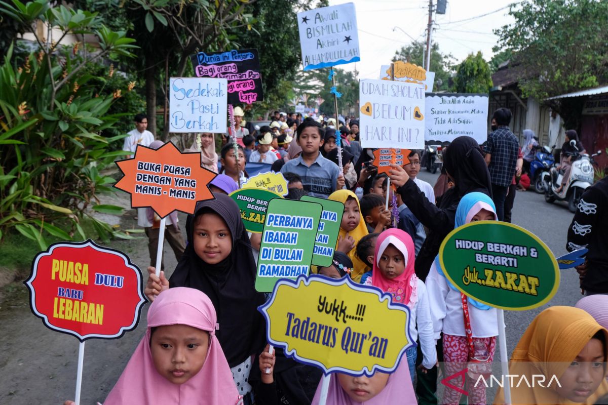 Siswa Taman Pendidikan Quran (TPQ) mengikuti pawai menyambut bulan Ramadhan 1444 Hijriyah di Kampung Sewu, Jebres, Solo, Jawa Tengah, Minggu (19/3/2023). Kegiatan itu bertujuan untuk mengajak umat muslim mempersiapkan diri agar dapat memaksimalkan ibadah pada bulan Ramadhan. ANTARAFOTO/Maulana Surya/aww.