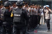 Polisi mengikuti apel pasukan di Polrestabes Surabaya, Jawa Timur, Rabu (22/3/2023). Polrestabes Surabaya mengerahkan 315 personel gabungan TNI, Polri, dan Satpol PP Kota Surabaya ke sejumlah titik lokasi untuk mengamankan kegiatan masyarakat dalam melaksanakan ibadah selama bulan Ramadhan. ANTARA FOTO/Didik Suhartono/pras.