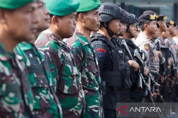 Personel TNI dan Polri mengikuti apel pasukan di Polrestabes Surabaya, Jawa Timur, Rabu (22/3/2023). Polrestabes Surabaya mengerahkan 315 personel gabungan TNI, Polri, dan Satpol PP Kota Surabaya ke sejumlah titik lokasi untuk mengamankan kegiatan masyarakat dalam melaksanakan ibadah selama bulan Ramadhan. ANTARA FOTO/Didik Suhartono/pras.