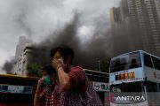 Petugas berupaya memadamkan api dalam musibah kebakaran sebuah gudang di Distrik Kowloon, Hong Kong, China, Jumat (24/3/2023). Sedikitnya 1.600 orang dievakuasi dari gedung yang dekat dengan gudang tersebut akibat asap berwarna kekuningan dan berbau menyengat sehingga ada kekhawatiran asap tersebut beracun. ANTARA FOTO/Reuters-Tyrone Siu/nym.